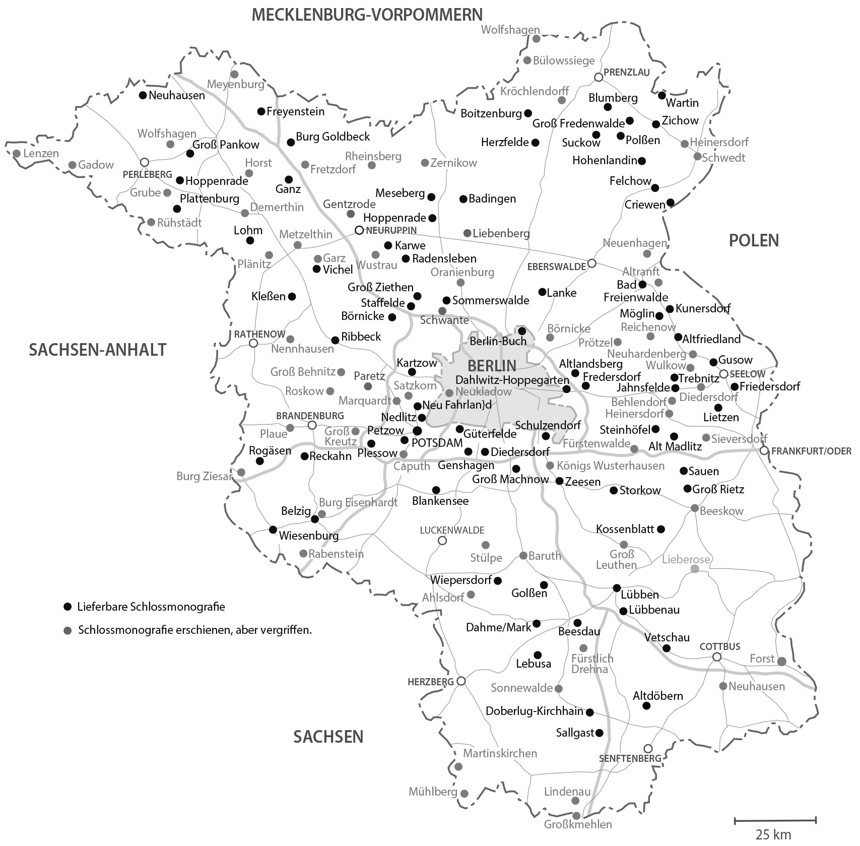 In der Karte finden Sie alle bisher erschienenen Titel der Reihe Schlösser und Gärten der Mark.